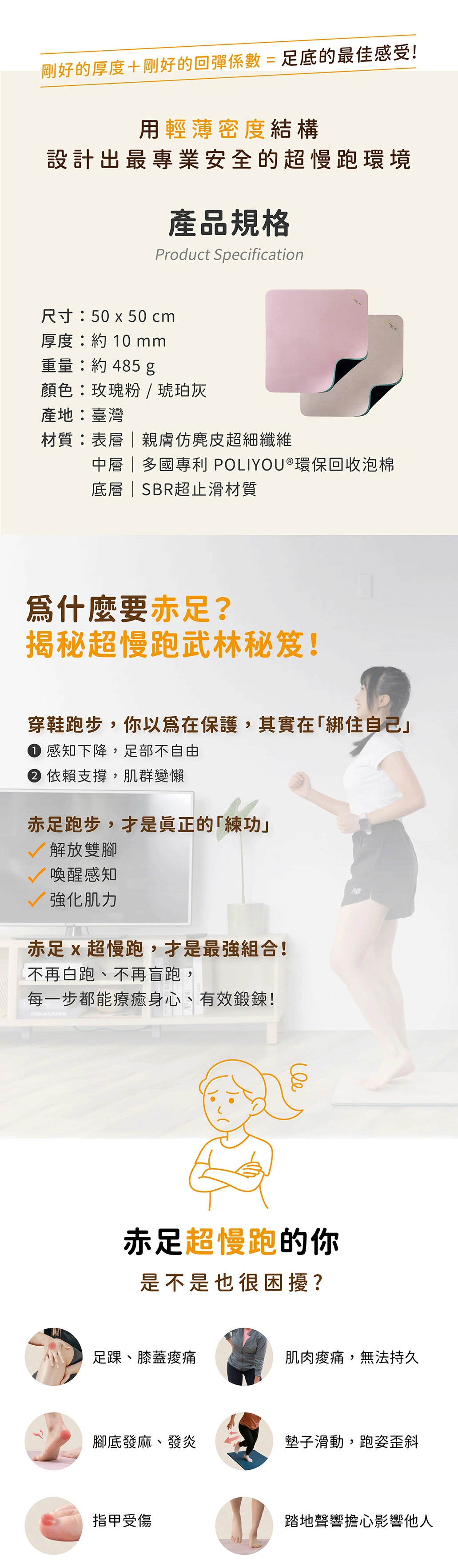 不要再用橡膠、TPE、EVA材質做的墊子了! TOMOTOMO 是全球最新且唯一使用專利環保材質的專業慢跑運動墊 給你完全不同的觸感與特性是其它材質無法提供的!
